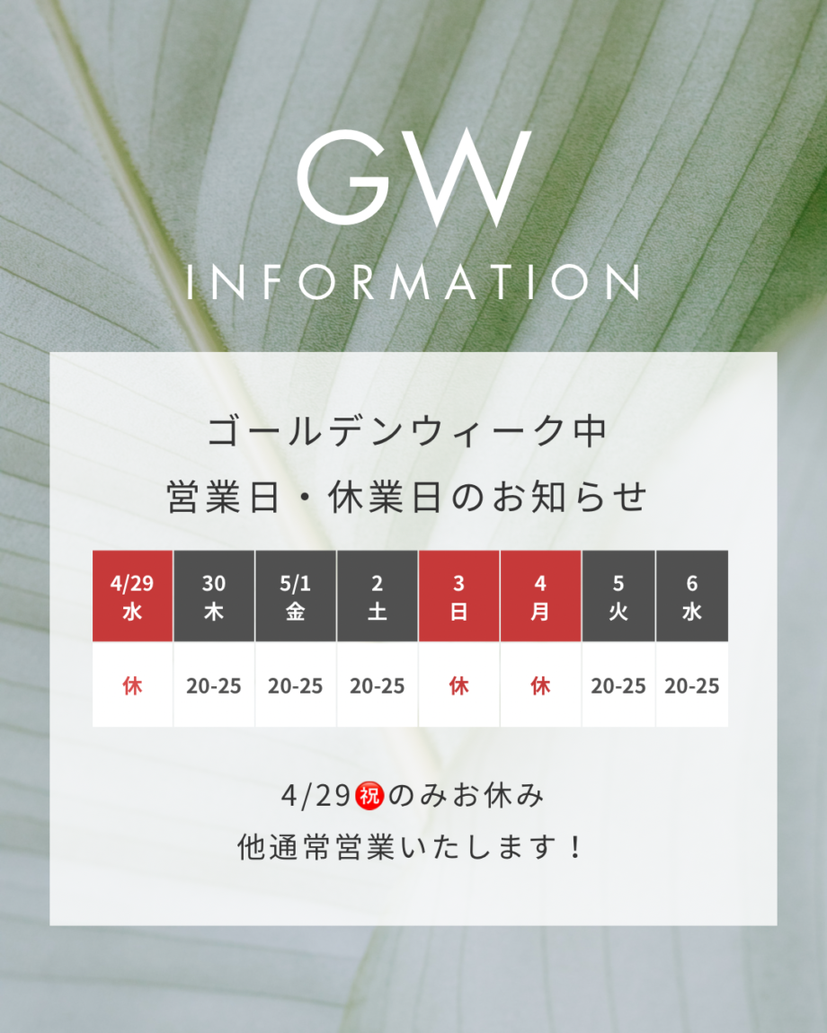 GW営業案内 投稿者: yuki2026年4月23日2026年4月23日BLOG、NEWS ◉GWの営業案内◉ 『cafe&barゆきっち』をご利用いただきありがとうございます😊 4/29日㊗️はお休みします。※お昼営業もお休み 他通常営業しますので、どうぞ、宜しくお願いします🙇♀️